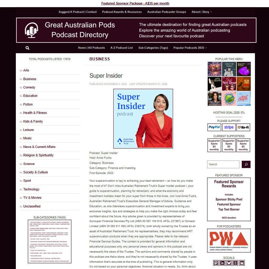 Super Insider Don't miss Australian Retirement Trust's Super Insider podcast – your guide to superannuation, planning for retirement, and what the economy and investment markets mean for your super from those in the know...