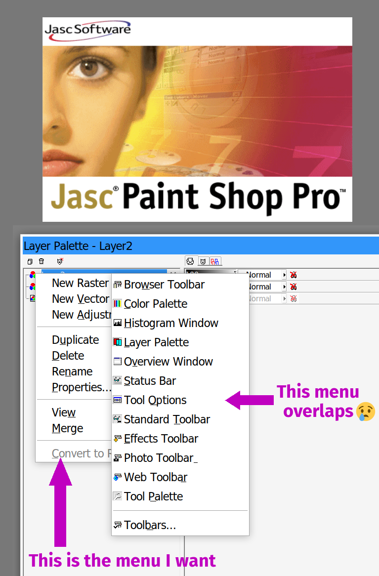 ▷ Right-clicking on a layer opens up two overlapping context menus, and the lower one (the one you would want) is not accessible. 😶